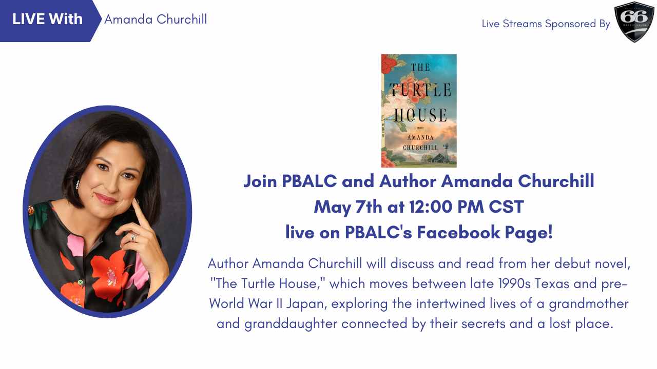 Join PBALC and Texan author Amanda Churchill on May 7th at 12 PM for an Author Series Live Stream. Churchill will discuss and read from her debut novel, “The Turtle House,” which moves between late 1990s Texas and pre-World War II Japan, exploring the intertwined lives of a grandmother and granddaughter connected by their secrets and a lost place.