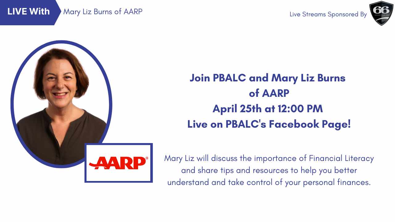 Financial literacy is a complicated subject, and many people do not feel equipped to manage their finances successfully. That’s why we’ve asked Mary Liz Burns of AARP to join us on April 25th at 12 PM to discuss the importance of Financial Literacy and share tips and resources to better understand and manage your finances.