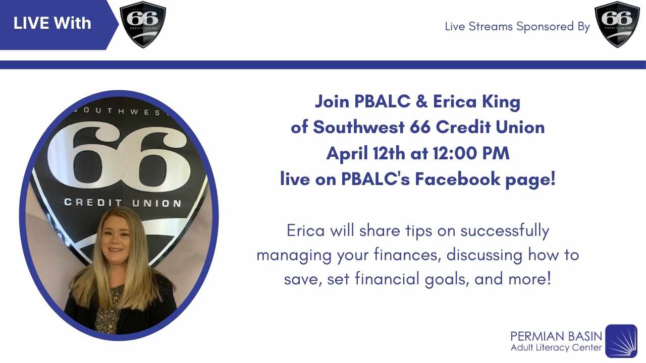 Join PBALC and Erica King of Southwest 66 Credit Union on April 12th at 12:00 PM live on PBALC’s Facebook page! Erica will share tips on successfully managing your finances, discussing how to save, set financial goals, and more!