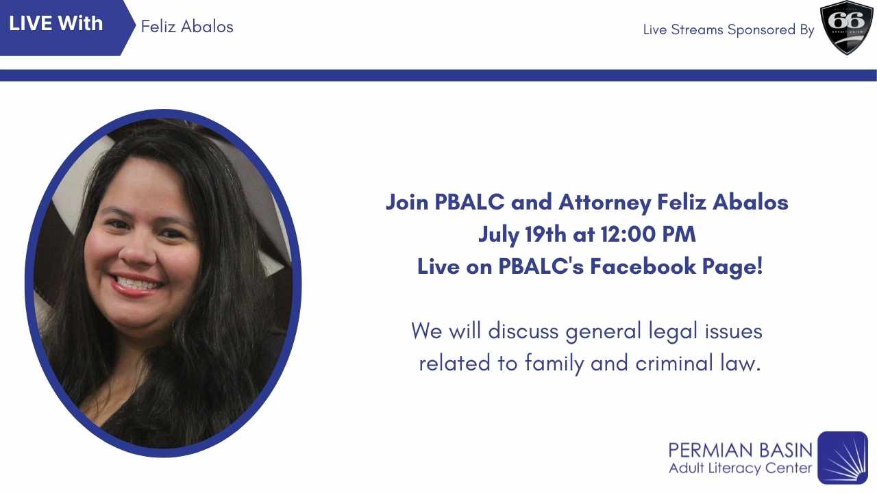 Join PBALC and attorney Feliz Abalos at our NEW time on July 19th at 12:00 PM live on PBALC’s Facebook page! We will discuss general legal issues related to family and criminal law.