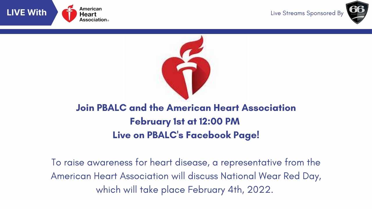 Join PBALC and the American Heart Association on February 1st at 12:00 PM live on PBALC’s Facebook Page! To raise awareness for heart disease, a representative from the American Heart Association will discuss National Wear Red Day, which will take place on February 4th, 2022.