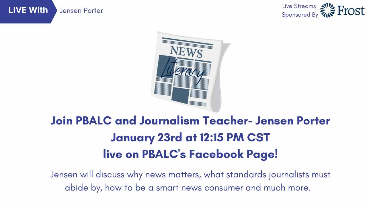 Join PBALC and Jensen Porter on Tuesday, January 23rd at 12:15 PM CST live on PBALC’s Facebook page! Jensen will discuss why news matters, what standards journalists must abide by, how to be a smart news consumer and much more.