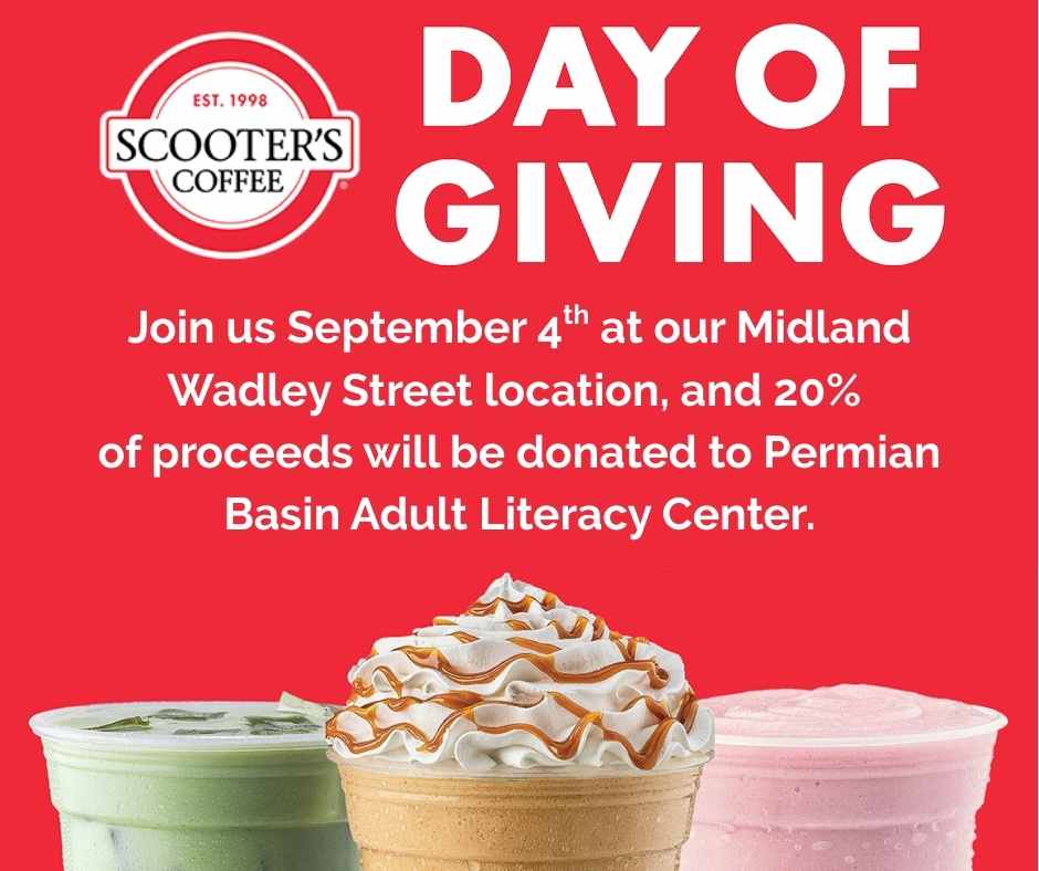 Join us at Scooter’s Coffee September 4th and support adult literacy in the Permian Basin! When you grab your favorite drink or treat, 20% of proceeds will be donated to PBALC’s Adult Literacy Programs, helping adult learners build brighter futures through reading, writing, and English skills.