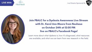 Join PBALC for a dyslexia awareness live stream with Dr. Karol Ann Moore from Neuhaus on October 24th at 12:00 PM live on PBALC's Facebook Page! Learn more about what dyslexia is, how it’s diagnosed, what resources are available, and what we can learn from new research in the field.