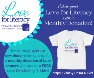 Now through 2/14, any new donor who shows their Love for Literacy and signs up for a monthly donation of $100 or more to PBALC will receive a free Love for Literacy T-shirt from PBALC. You can set up your monthly donation at https://pbalc.org/donate/