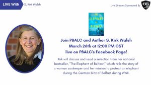 Join PBALC and Author S. Kirk Walsh on March 26th at 12:00 PM CST live on PBALC's Facebook Page! Kirk will discuss and read a selection from her national bestseller, “The Elephant of Belfast,” which tells the story of a woman zookeeper and her mission to protect an elephant during the German blitz of Belfast during WWII. Thank you ...