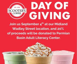 Join us at Scooter’s Coffee September 4th and support adult literacy in the Permian Basin! When you grab your favorite drink or treat, 20% of proceeds will be donated to PBALC’s Adult Literacy Programs, helping adult learners build brighter futures through reading, writing, and English skills. 📅 Thursday, September 4th 7 AM-10 PM 📍 702 W. Wadley Ave., Midland, TX ...